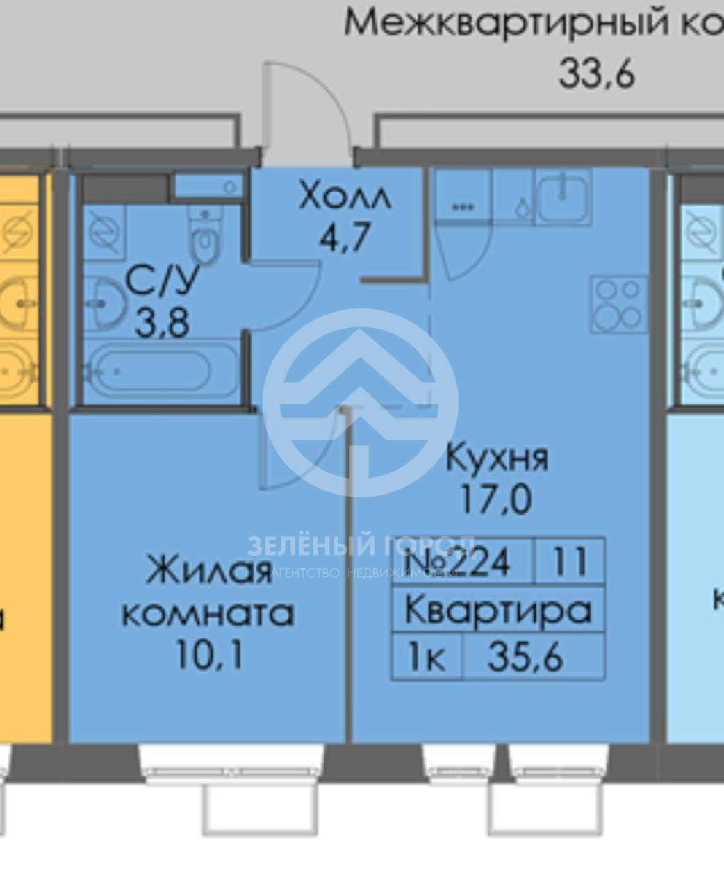Общая площадь 35,2 кв.м., кухня-гостинная 17 кв.м, комната 10,1 совмещенный санузел.